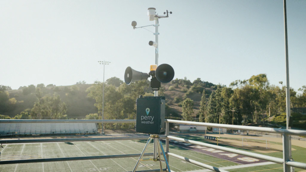 Perry Weather’s on-site weather stations measure WBGT directly at the field — not from a regional model, not from a forecast, but from instruments installed at your facility. Temperature, humidity, wind speed, and solar radiation are all measured in real time and combined into a live WBGT reading that updates continuously.