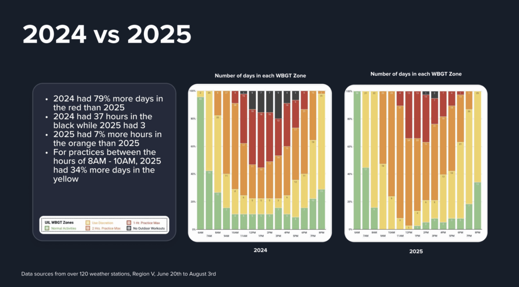 The UIL WBGT data painted a clear picture: heat risk in Texas is both extreme and unpredictable, changing sharply year-to-year and by region.